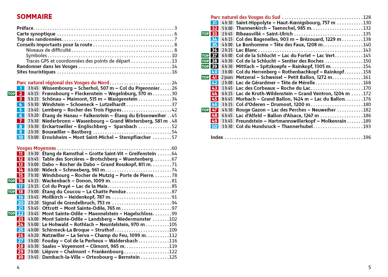 Bernhard Pollmann et Thomas Striebig ont sélectionné parmi les milliers de possibilités existantes, 50 randonnées séduisantes qui devraient permettre de faire connaissance avec l'ensemble des Vosges. Il décrit de courtes randonnées mais aussi des excursions de montagne difficiles de manière à satisfaire tout le monde : familles avec enfants mais aussi amateurs de grande randonnée et autres sportifs en parfaite condition physique.Des coordonnées GPS peuvent également être téléchargées sur le site Internet de l'éditeur.