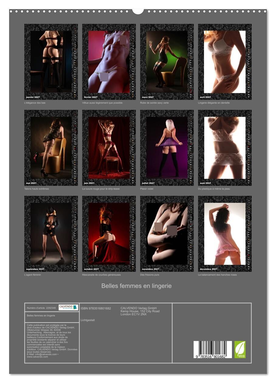 Un calendrier plein de charme et d'élégance.Laissez-vous accompagner tout au long de l'année par un calendrier raffiné mettant en valeur de magnifiques photos de femmes en lingerie. Chaque mois révèle une image soigneusement sélectionnée, alliant est...Un calendrier plein de charme et d'élégance.Laissez-vous accompagner tout au long de l'année par un calendrier raffiné mettant en valeur de magnifiques photos de femmes en lingerie. Chaque mois révèle une image soigneusement sélectionnée, alliant esthétique, douceur et élégance.Les modèles restent anonymes, permettant à chacun d'apprécier simplement la beauté des images et l'atmosphère artistique qui s'en dégage. Subtil et harmonieux, ce calendrier est pensé pour plaire aussi bien aux femmes qu'aux hommes.Un objet décoratif qui apporte une touche de charme et de style à votre intérieur, tout en célébrant la beauté sous un regard moderne et respectueux.Un calendrier à regarder, à apprécier... et à partager.