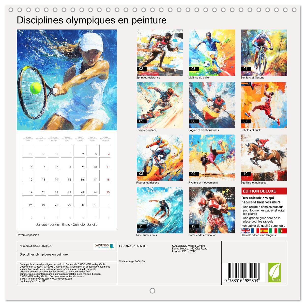 Découvrez la beauté et l'énergie des sports olympiques à travers une peinture, réalisée à l'aide de l'IA, célébrant une discipline différente chaque mois. Parfait pour les passionnés de sport et les amateurs d'art, ce calendrier est le cade...