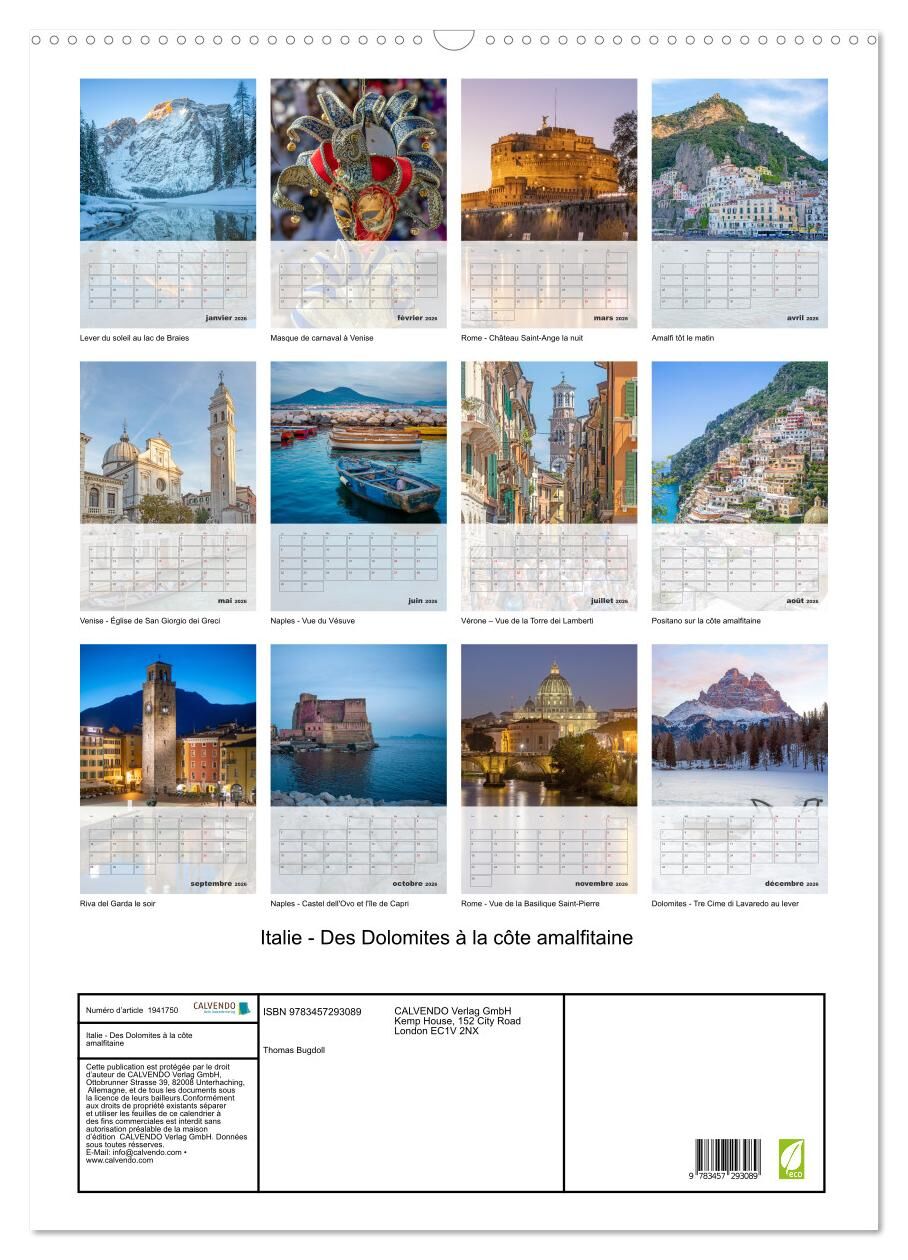 L'Italie en images - Un voyage éblouissant à travers les trésors du pays. Offrez à vos murs un voyage à travers l'Italie avec notre magnifique calendrier photo. De la majesté des Dolomites aux eaux azurées de la côte amalfitaine, de l'histoire intemporelle de Rome à la magie de Venise, en passant par le romantisme de Vérone, les paysages enchanteurs de Naples et bien plus encore, chaque mois vous emmène au cur de l'Italie. Laissez-vous envoûter par la beauté de ses paysages, son architecture incomparable et son atmosphère unique. Un véritable hommage à la dolce vita à découvrir toute l'année ! Ce calendrier est une source d'inspiration et une invitation au voyage à travers chaque image. À offrir ou à s'offrir, pour tous les amoureux de l'Italie et des voyages. Calendrier mural de qualité supérieure avec 12 magnifiques photos. L'environnement nous tient à cur. C'est pourquoi nous utilisons exclusivement du papier certifié FSC provenant de forêts gérées de manière écoresponsable. Nous évitons la surproduction et donc des quantités significatives de déchets, en produisant dans l'UE à l'unité et sur demande. Nous réduisons nos distances de transport et assurons une logistique respectueuse de l'environnement. 14 pages dont 1 couverture | 12 pages mensuelles | 1 page d'index | dos cartonné Illustrations: Janvier: Lever du soleil au lac de Braies Février: Masque de carnaval à Venise Mars: Rome - Château Saint-Ange la nuit Avril: Amalfi tôt le matin Mai: Venise - Église de San Giorgio dei Greci Juin: Naples - Vue du Vésuve Juillet: Vérone - Vue de la Torre dei Lamberti Août: Positano sur la côte amalfitaine Septembre: Riva del Garda le soir Octobre: Naples - Castel dell'Ovo et l'île de Capri Novembre: Rome - Vue de la Basilique Saint-Pierre Décembre: Dolomites - Tre Cime di Lavaredo au lever QUALITATIF - un calendrier annuel de qualité supérieure avec 12 magnifiques motifs, sur papier d'impression photo, avec une reliure spirale robuste et un crochet de suspension. DURABLE - réduction significative des déchets grâce à une fabrication sur papier certifié FSC à l'unité et sur demande, production dans l'UE, logistique écologique. CADEAU IDÉAL - destiné à vos contacts privés ou professionnels, à la famille ou aux amis, aux jeunes adultes ou aux moins jeunes, pour un cadeau de Noël ou d'anniversaire ou juste pour le plaisir d'offrir. DIVERSIFIÉ - de nombreux formats DIN A4 ou DIN A3, pour s'adapter à toutes vos envies et vos cadres de vie. Photos de villes et de paysages du nord et du centre de l'Italie jusqu'à la côte amalfitaine. par l'auteur(rice): Thomas Bugdoll
