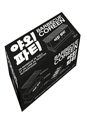 Coffret contenant un barbecue coréen avec son support en bois et son grill en acier inoxydable, ainsi que des recettes de viandes, de poissons et de légumes.