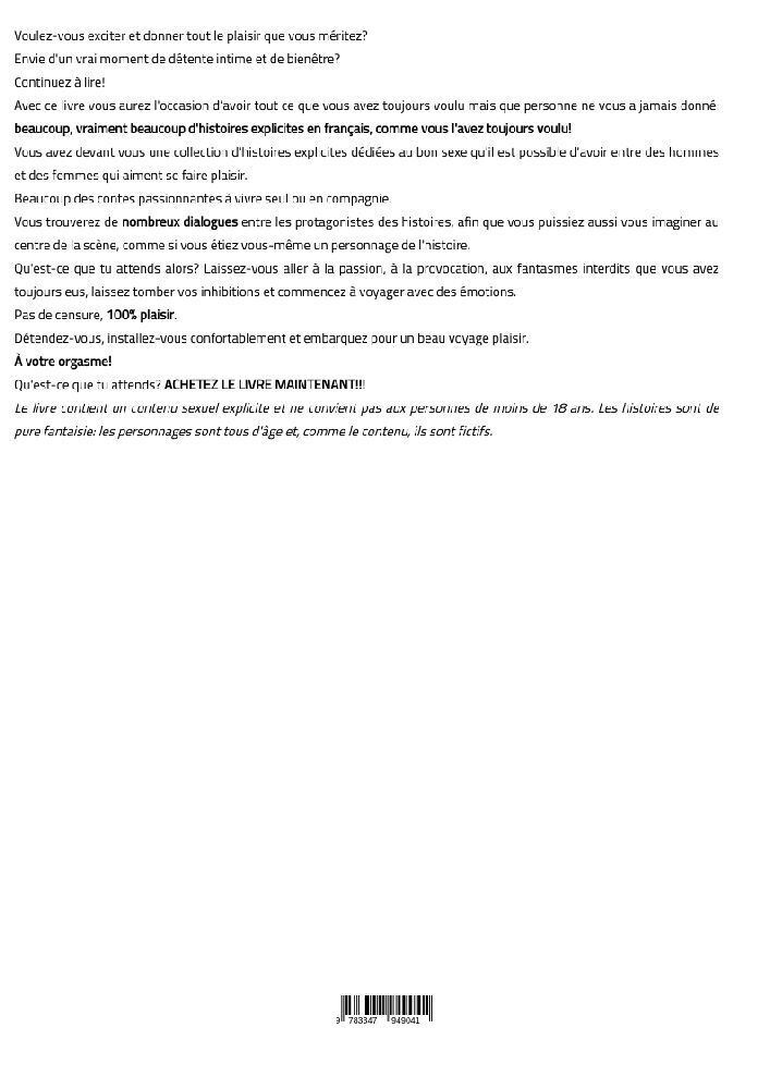 Großdruckausgabe Vous avez devant vous une collection d'histoires explicites dédiées au bon sexe qu'il est possible d'avoir entre des hommes et des femmes qui aiment se faire plaisir. Beaucoup des contes passionnantes à vivre seul ou en compagnie. Vous trouver...