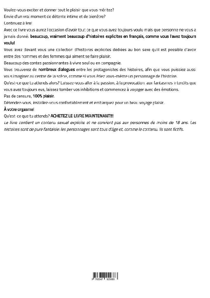 Großdruckausgabe Vous avez devant vous une collection d'histoires explicites dédiées au bon sexe qu'il est possible d'avoir entre des hommes et des femmes qui aiment se faire plaisir. Beaucoup des contes passionnantes à vivre seul ou en compagnie. Vous trouver...