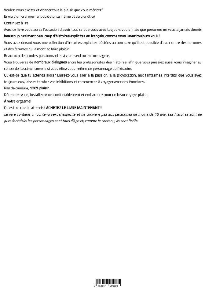 Großdruckausgabe Vous avez devant vous une collection d'histoires explicites dédiées au bon sexe qu'il est possible d'avoir entre des hommes et des femmes qui aiment se faire plaisir. Beaucoup des contes passionnantes à vivre seul ou en compagnie. Vous trouver...
