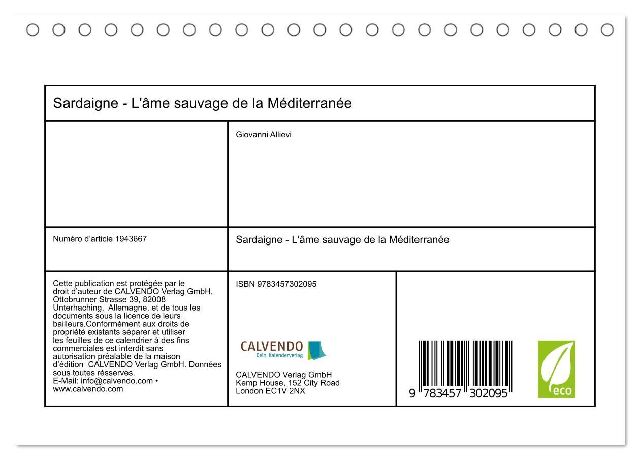 Révélez l'explorateur qui sommeille en vous avec "Sardaigne - L'âme sauvage de la Méditerranée". Ce calendrier n'est pas seulement une série d'images, c'est un voyage au coeur de l'âme de la Sardaigne. Découvrez la beaut...Révélez l'explorateur qui sommeille en vous avec "Sardaigne - L'âme sauvage de la Méditerranée". Ce calendrier n'est pas seulement une série d'images, c'est un voyage au coeur de l'âme de la Sardaigne. Découvrez la beauté sauvage de l'île : des plages immaculées qui murmurent des histoires anciennes et des paysages accidentés qui reflètent son esprit sauvage. Chaque mois, plongez dans le charme brut et authentique de ce joyau méditerranéen. Sentez le vent, goûtez le sel et découvrez l'esprit intemporel de la Sardaigne. Parfait pour ceux qui ont soif d'aventure et recherchent le coeur d'une île véritablement unique. Apportez l'âme sauvage de la Sardaigne chez vous. Commandez votre calendrier dès aujourd'hui !
