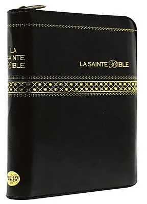 Le texte biblique dans la version Segond révisée de 1910 et avec les paroles de Jésus en rouge, dans un ouvrage à onglets portant une reliure en similicuir noir, des tranches dorées et une glissière.