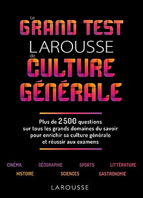 Le grand test Larousse de culture générale Plus de 2 500 questions de culture générale pour tester ses connaissances dans tous les domaines du savoir (histoire, littérature, cinéma, sciences, géographie, musique...) et réussir aux examens. Avec : Des quiz thé...