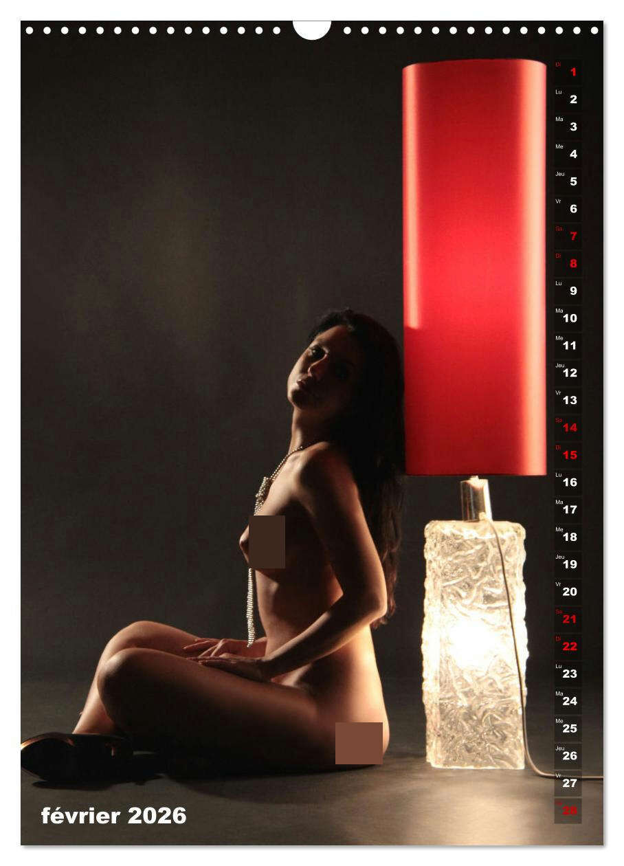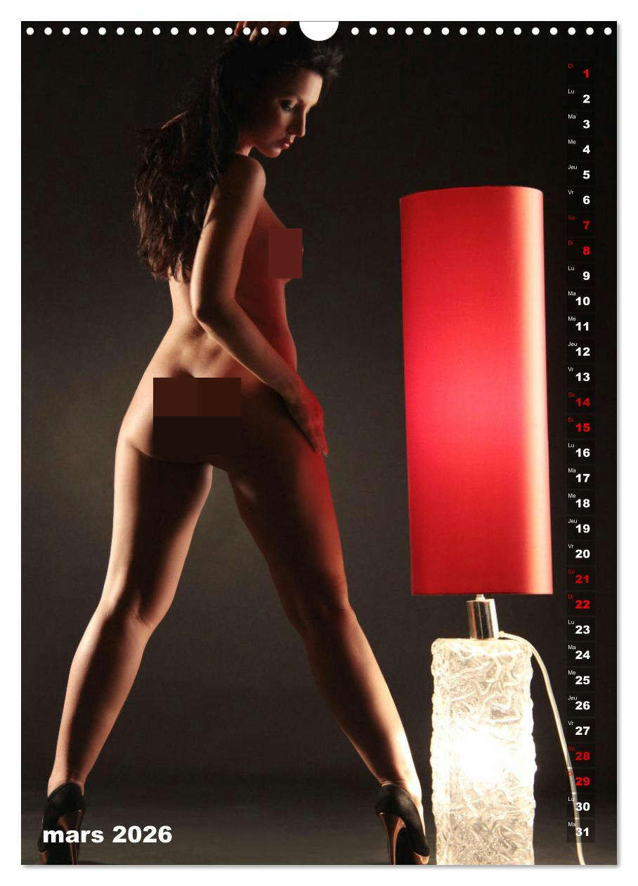 Vous n'avez pas besoin de beaucoup de matériel pour photographier du nu. Une lampe de salon ancienne qui diffuse une lumière rouge et chaude suffit ici. Le modèle pose devant, derrière et à côté de la lampe, la lumière fait le reste. La femme nue est sens...