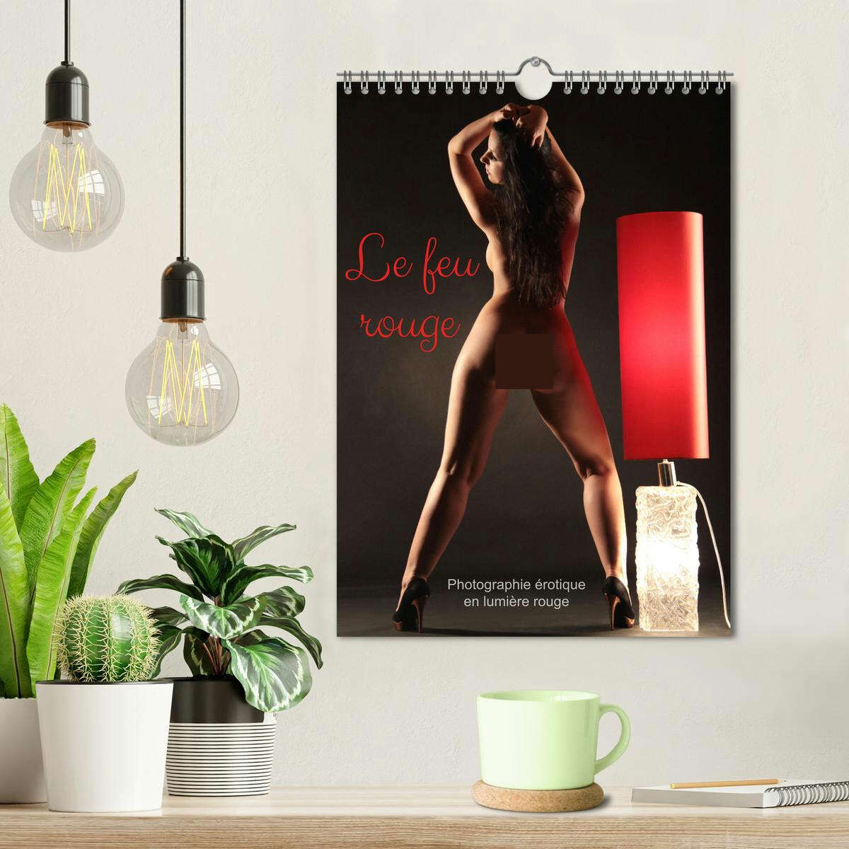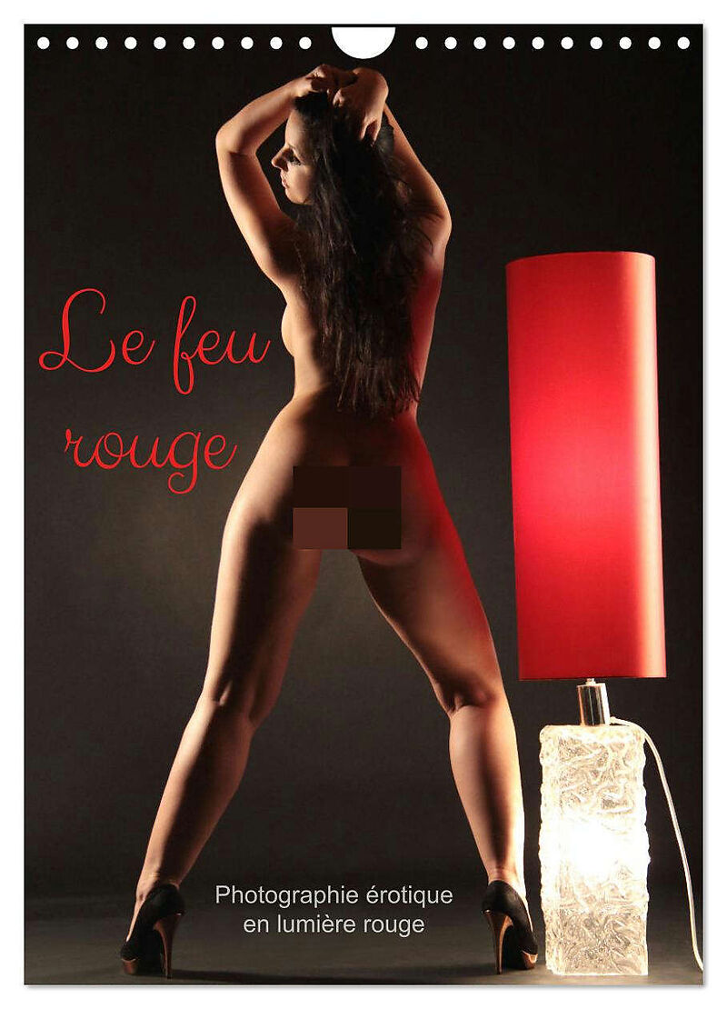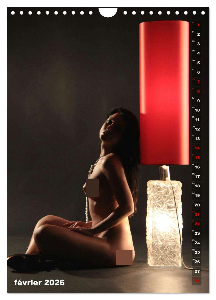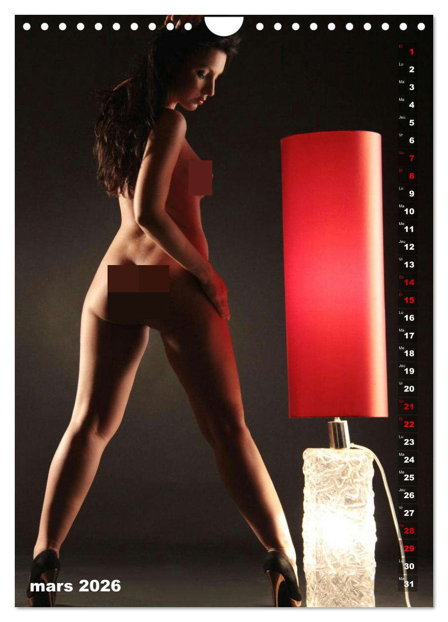 Vous n'avez pas besoin de beaucoup de matériel pour photographier du nu. Une lampe de salon ancienne qui diffuse une lumière rouge et chaude suffit ici. Le modèle pose devant, derrière et à côté de la lampe, la lumière fait le reste. La femme nue est sens...