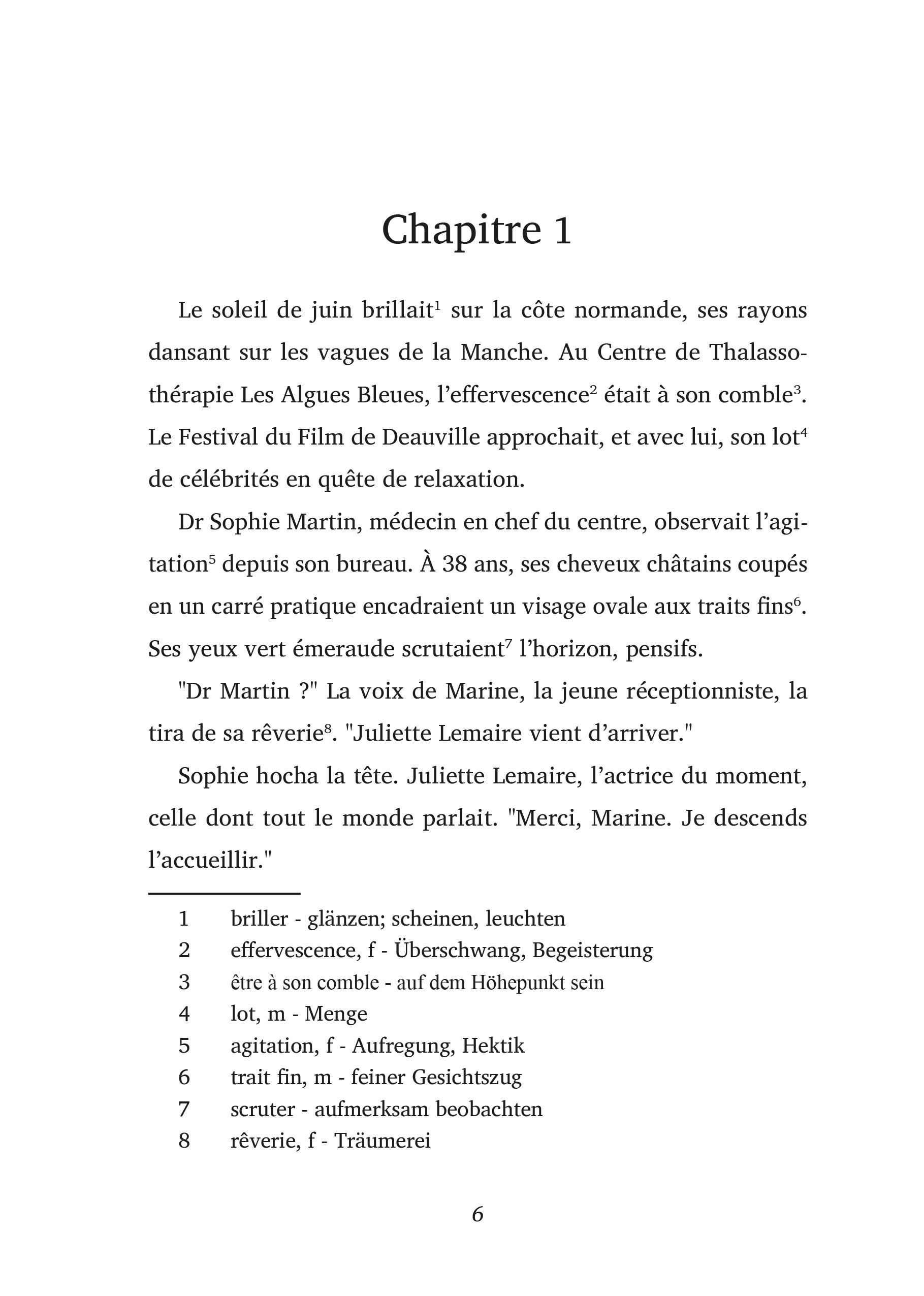 Le Masque de boue mortel - Die tödliche SchlammmaskeWillkommen im exklusiven Thalasso-Zentrum "Les Algues Bleues" an der normannischen Küste - ein Ort der Entspannung, der plötzlich zum Schauplatz eines tödlichen Dramas wird.Als die berühmte Schauspi...Le Masque de boue mortel - Die tödliche SchlammmaskeWillkommen im exklusiven Thalasso-Zentrum "Les Algues Bleues" an der normannischen Küste - ein Ort der Entspannung, der plötzlich zum Schauplatz eines tödlichen Dramas wird.Als die berühmte Schauspielerin Juliette Lemaire tot in der Schönheitskabine aufgefunden wird, verwandelt sich das idyllische Spa in einen Hexenkessel aus Intrigen, Geheimnissen und Verdächtigungen. War es wirklich nur ein tragischer Unfall oder steckt mehr dahinter?Dr. Sophie Martin, die scharfsinnige Chefärztin, und Hugo Dupont, der charmante Masseur, finden sich unversehens in der Rolle von Ermittlern wieder. Gemeinsam tauchen sie in die Abgründe der Filmbranche ein, wo hinter glamourösen Fassaden Eifersucht, Korruption und Machtgier lauern.Können Sophie und Hugo die Wahrheit aufdecken, bevor der Mörder erneut zuschlägt? Und welche Rolle spielt das mysteriöse Parfüm, das immer wieder auftaucht?Lassen Sie sich von dieser spannenden Mischung aus Krimi und Wellness-Ambiente in den Bann ziehen. "Die tödliche Schlammmaske" ist der packende Auftakt einer neuen Krimi-Reihe, die Sie bis zur letzten Seite in Atem halten wird.Tauchen Sie ein in eine Welt voller überraschender Wendungen, faszinierender Charaktere und der einzigartigen Atmosphäre der normannischen Küste. Tauchen Sie ein in eine Serie fesselnder Krimis, die Ihr Herz schneller schlagen lassen und Ihr Französisch auf das nächste Level bringen. Diese Geschichten sind keine trockenen Lerntexte, sondern nervenaufreibende Pageturner, die Sie mitten in die Action katapultieren. Speziell für Französischlernende auf B1-B2-Niveau entwickelt, wartet hinter jedem Kapitel nicht nur ein spannendes Abenteuer, sondern auch ein umfassendes Wörterbuch. Fremde Begriffe? Kein Problem! Nach jedem Kapitel finden Sie die Übersetzungen, die Ihnen helfen, ohne den Lesefluss zu stören. So können Sie sich voll und ganz in die Handlung vertiefen und gleichzeitig Ihr Sprachgefühl verfeinern. Ideal für alle, die Krimis lieben und dabei ganz nebenbei ihr Französisch verbessern möchten.