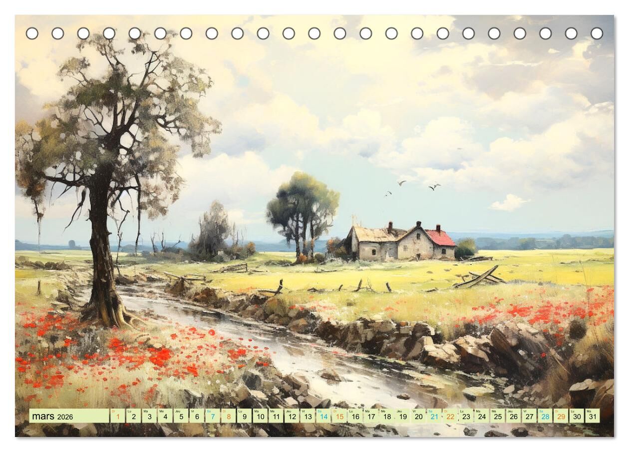 Chaque mois, plongez dans un monde de charme rural et d'évasion paisible avec ce calendrier illustré. Chaque page vous transporte dans une campagne pittoresque, où des maisons rustiques se blottissent près d'arbres majestueux, créant des scènes de be...