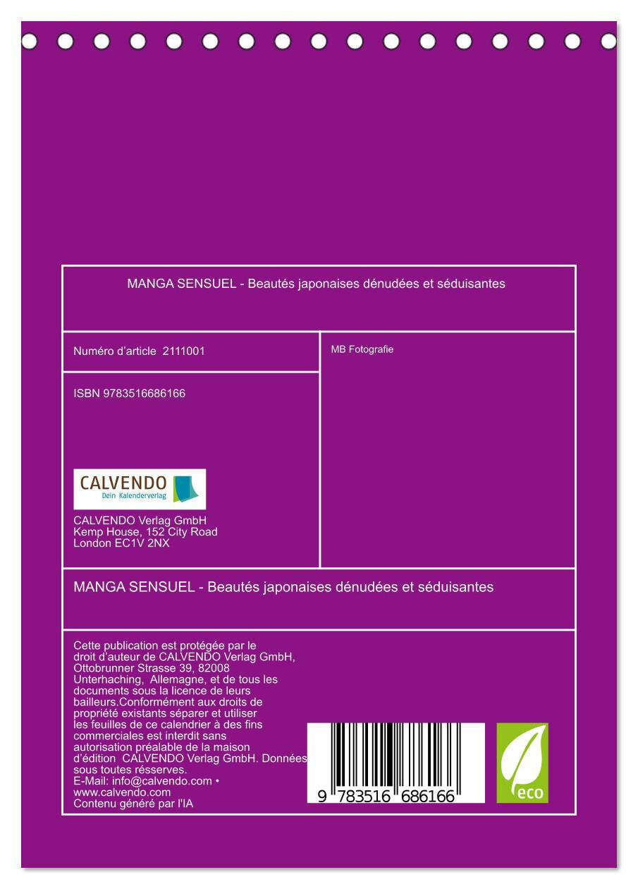 Les beautés japonaises sensuelles, l'art manga érotique et le charme raffiné du féminin se réunissent dans ce calendrier mural unique. Chaque page met en scène de jeunes femmes séduisantes, représentées avec délicatesse et élégance dans des décors inspirés de l'art japonais traditionnel. Les couleurs éclatantes, les ambiances envoûtantes et les détails soignés créent une atmosphère à la fois moderne et captivante. Réalisées par intelligence artificielle, ces illustrations révèlent une esthétique originale où sensualité et art visuel se rencontrent. Idéal pour les passionnés d'anime et de culture japonaise, ce calendrier séduira également les amateurs d'illustrations sensuelles. Une décoration murale raffinée et un cadeau audacieux qui attire tous les regards. Calendrier de bureau de qualité supérieure avec 12 magnifiques photos. L'environnement nous tient à cur. C'est pourquoi nous utilisons exclusivement du papier certifié FSC provenant de forêts gérées de manière écoresponsable. Nous évitons la surproduction et donc des quantités significatives de déchets, en produisant dans l'UE à l'unité et sur demande. Nous réduisons nos distances de transport et assurons une logistique respectueuse de l'environnement. 14 pages dont 1 couverture | 12 pages mensuelles | 1 page d'index I dos cartonné. Illustrations: Janvier: Fille manga sensuelle aux cheveux bleus Février: Beauté manga nue au ruisseau Mars: Jeune blonde dénudée au soleil Avril: Geisha manga séduisante en kimono bleu Mai: Fille manga aux cheveux roses Juin: Beauté japonaise nue aux cheveux roses Juillet: Beauté blonde nue au coucher du soleil Août: Jeune japonaise sensuelle aux cheveux violets Septembre: Fille nue dans un champ de fleurs Octobre: Jeune femme nue sous les cerisiers Novembre: Japonaise sensuelle en kimono sous la neige Décembre: Beauté japonaise allongée au lit QUALITATIF - un calendrier annuel de qualité supérieure avec 12 magnifiques motifs, sur papier d'impression photo, avec une reliure spirale robuste. DURABLE - réduction significative des déchets grâce à une fabrication sur papier certifié FSC à l'unité et sur demande, production dans l'UE, logistique écologique. CADEAU IDÉAL - destiné à vos contacts privés ou professionnels, à la famille ou aux amis, pour un cadeau de Noël ou d'anniversaire ou juste pour le plaisir d'offrir. DIVERSIFIÉ - de nombreux formats DIN A4 ou DIN A3, pour s'adapter à toutes vos envies et vos cadres de vie. Beautés japonaises sensuelles en style manga, scènes dénudées élégantes et charme raffiné pour amateurs d'art et passionnés d'anime par l'auteur(rice): Michael Bihlmayer