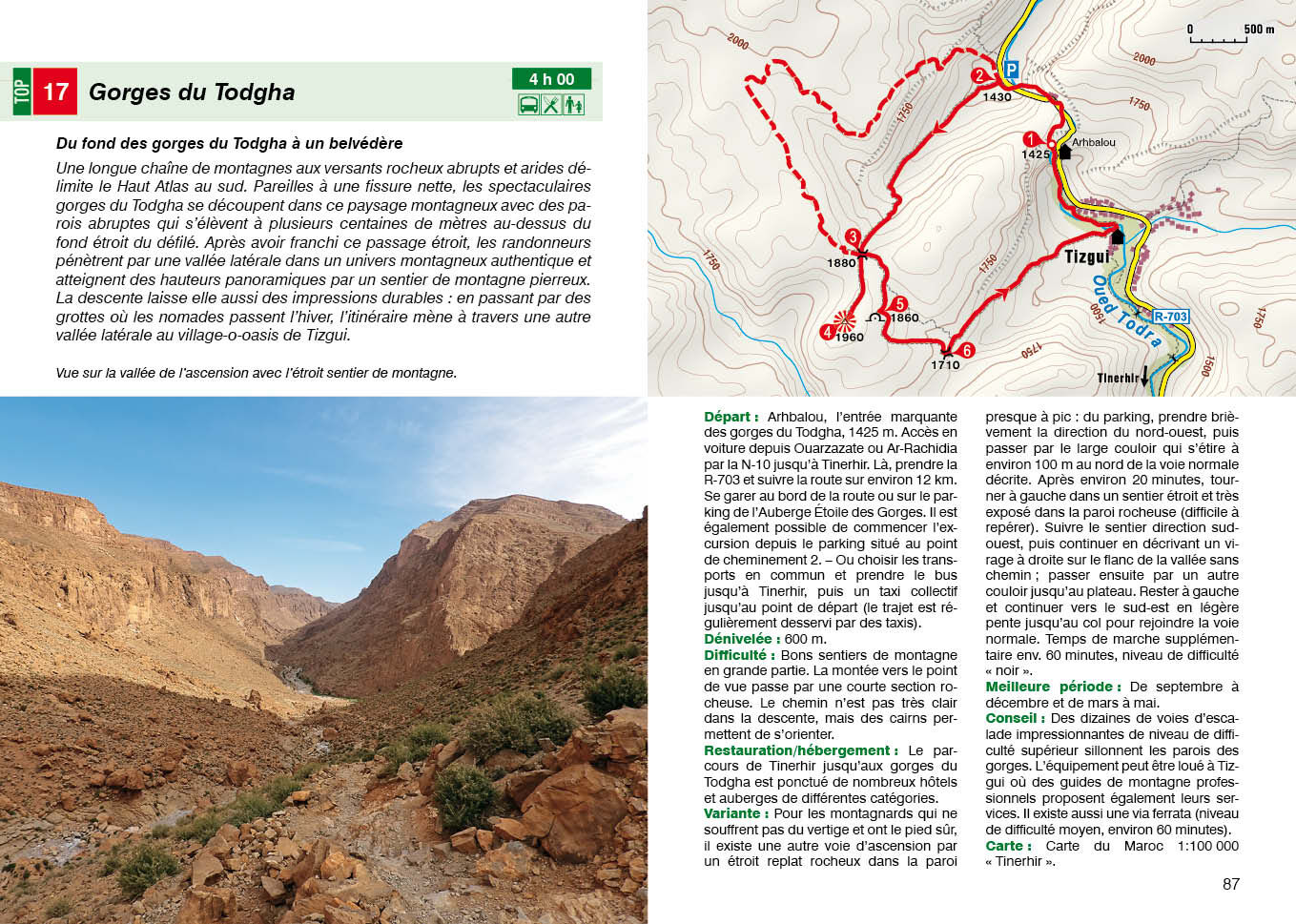 La « magie de l'Orient » commence à quelques miles nautiques seulement de l'Europe : au Maroc, là où l'Atlantique et la Méditerranée se rencontrent. Le royaume du Maroc n'enchante pas seulement par ses parfums exotiques, ses villes et ses villages dignes des Mille et Une Nuits, mais aussi par une nature spectaculaire et un éventail insoupçonné de randonnées possibles entre la côte et la haute montagne. Le guide de randonnées Rother « Maroc » présente 52 itinéraires variés des randonnées passionnantes d'une demi-journée aux entreprises de plusieurs jours dans des paysages encore intacts.Les randonneurs à la recherche de sensations fortes en haute montagne y trouveront leur compte, tout comme les randonneurs amateurs pour qui l'expérience culturelle et la beauté de la nature sont primordiales. Les montagnes du Rif, au caractère méditerranéen et aux reliefs sauvages, et les roches karstiques du Moyen Atlas enthousiasment les visiteurs de tous horizons. Les sommets culminant à 4000 m dans le Haut Atlas sont imposants, mais relativement faciles à gravir. Des randonnées agréables mènent à l'Anti-Atlas avec ses pittoresques villages de maisons en pisé. Et dans le Sahara, dans le sud du pays, on peut entreprendre de magnifiques randonnées à travers des paysages de dunes et vers des oasis avec des palmeraies. Enfin, des hébergements confortables et la cuisine marocaine avec couscous et thé à la menthe sont les garants d'un repos bien mérité le soir. L'auteur, Michael Wellhausen, est un randonneur de montagne aussi ambitieux que grand voyageur. Son expérience de l'Afrique et du Sahara se reflète dans les textes qui, outre des descriptions exactes des randonnées, offrent de nombreuses informations intéressantes sur le pays et ses habitants. Des informations détaillées sur les transports, les restaurants et les hébergements, des cartes de randonnée avec le tracé de l'itinéraire, des profils d'altitude pertinents et des données GPS à télécharger facilitent la planification et la réalisation des randonnées. Quant aux nombreuses photos, elles font déjà naître à la maison une ambiance de vacances « orientales ».
