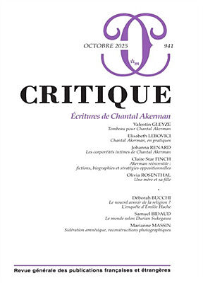 Écritures de Chantal Akerman Dix ans après sa disparition, Chantal Akerman reste plus que jamais notre contemporaine. Tandis que ses films et installations font l'objet de nombreuses rétrospectives et expositions, s'imposent également ce que ce numéro de Crit...