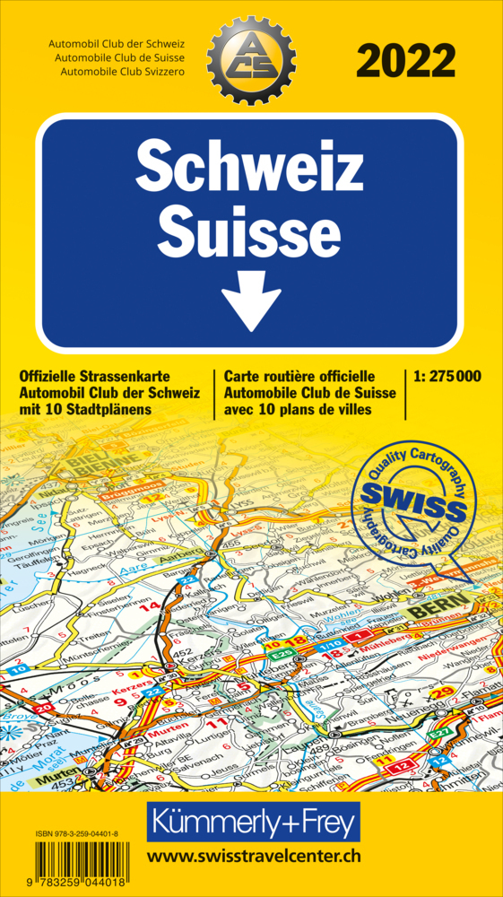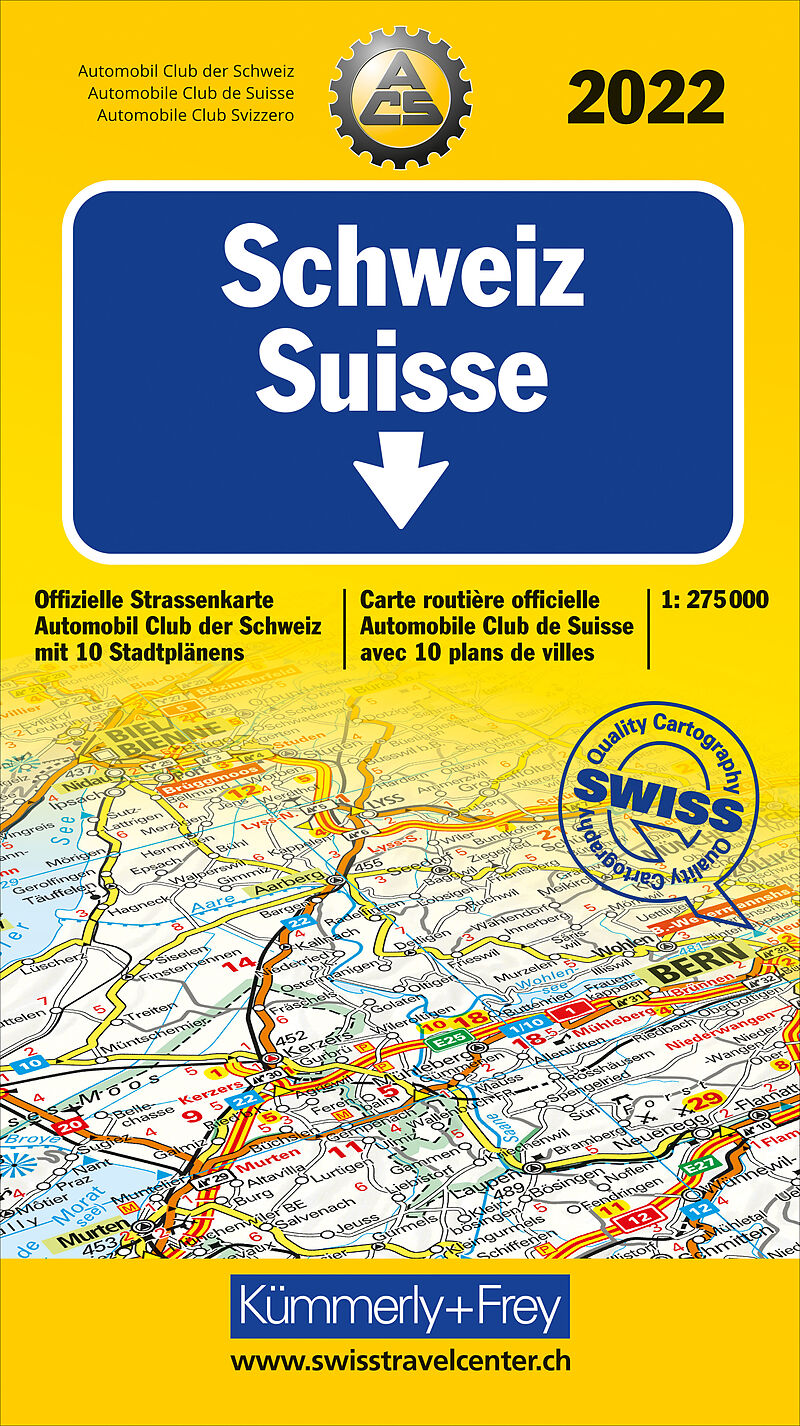 Neu: Offizielle Strassenkarte des Automobil Clubs der Schweiz ACS, Ausgabe 2022.Strassenkarte der Schweiz im Massstab 1:275 000, mit 4-sprachiger Legende. Die Rückseite enthält 10 Stadtpläne sowie eine Distanzentabelle, Strassentunnels und Adressen von Automob...