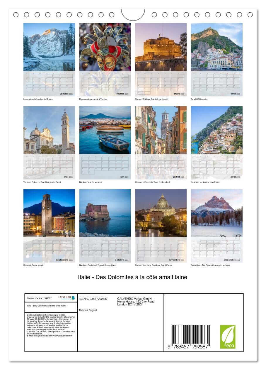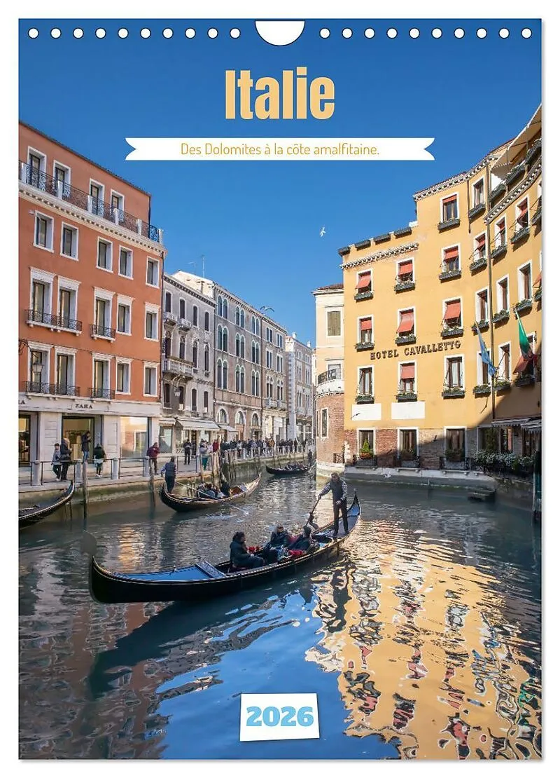 L'Italie en images - Un voyage éblouissant à travers les trésors du pays.Offrez à vos murs un voyage à travers l'Italie avec notre magnifique calendrier photo. De la majesté des Dolomites aux eaux azurées de la côte amalfitaine, de l'histoire in...L'Italie en images - Un voyage éblouissant à travers les trésors du pays.Offrez à vos murs un voyage à travers l'Italie avec notre magnifique calendrier photo. De la majesté des Dolomites aux eaux azurées de la côte amalfitaine, de l'histoire intemporelle de Rome à la magie de Venise, en passant par le romantisme de Vérone, les paysages enchanteurs de Naples et bien plus encore, chaque mois vous emmène au coeur de l'Italie.Laissez-vous envoûter par la beauté de ses paysages, son architecture incomparable et son atmosphère unique. Un véritable hommage à la dolce vita à découvrir toute l'année !Ce calendrier est une source d'inspiration et une invitation au voyage à travers chaque image.À offrir ou à s'offrir, pour tous les amoureux de l'Italie et des voyages.