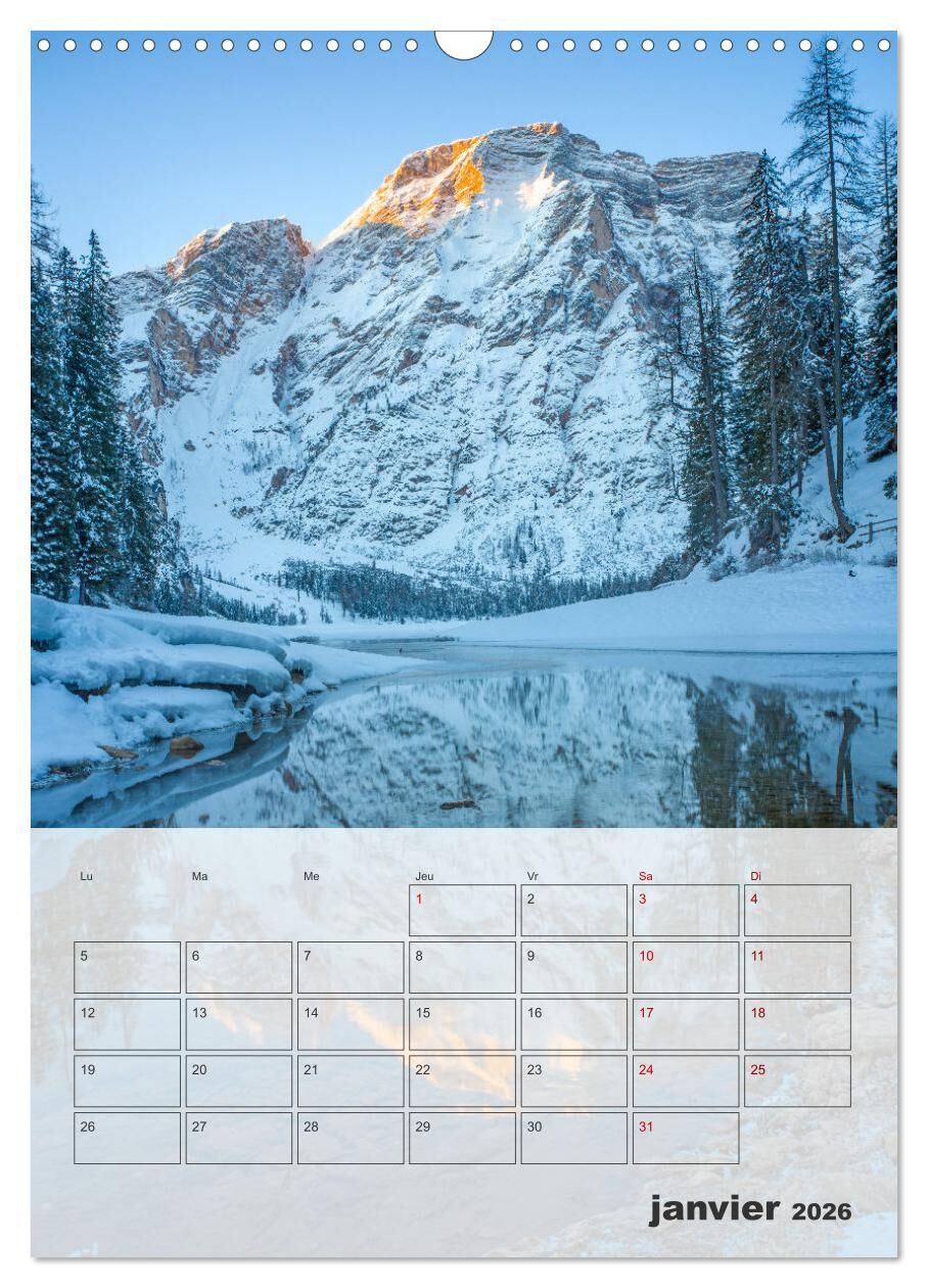 L'Italie en images - Un voyage éblouissant à travers les trésors du pays. Offrez à vos murs un voyage à travers l'Italie avec notre magnifique calendrier photo. De la majesté des Dolomites aux eaux azurées de la côte amalfitaine, de l'histoire intemporelle de Rome à la magie de Venise, en passant par le romantisme de Vérone, les paysages enchanteurs de Naples et bien plus encore, chaque mois vous emmène au cur de l'Italie. Laissez-vous envoûter par la beauté de ses paysages, son architecture incomparable et son atmosphère unique. Un véritable hommage à la dolce vita à découvrir toute l'année ! Ce calendrier est une source d'inspiration et une invitation au voyage à travers chaque image. À offrir ou à s'offrir, pour tous les amoureux de l'Italie et des voyages. Calendrier mural de qualité supérieure avec 12 magnifiques photos. L'environnement nous tient à cur. C'est pourquoi nous utilisons exclusivement du papier certifié FSC provenant de forêts gérées de manière écoresponsable. Nous évitons la surproduction et donc des quantités significatives de déchets, en produisant dans l'UE à l'unité et sur demande. Nous réduisons nos distances de transport et assurons une logistique respectueuse de l'environnement. 14 pages dont 1 couverture | 12 pages mensuelles | 1 page d'index | dos cartonné Illustrations: Janvier: Lever du soleil au lac de Braies Février: Masque de carnaval à Venise Mars: Rome - Château Saint-Ange la nuit Avril: Amalfi tôt le matin Mai: Venise - Église de San Giorgio dei Greci Juin: Naples - Vue du Vésuve Juillet: Vérone - Vue de la Torre dei Lamberti Août: Positano sur la côte amalfitaine Septembre: Riva del Garda le soir Octobre: Naples - Castel dell'Ovo et l'île de Capri Novembre: Rome - Vue de la Basilique Saint-Pierre Décembre: Dolomites - Tre Cime di Lavaredo au lever QUALITATIF - un calendrier annuel de qualité supérieure avec 12 magnifiques motifs, sur papier d'impression photo, avec une reliure spirale robuste et un crochet de suspension. DURABLE - réduction significative des déchets grâce à une fabrication sur papier certifié FSC à l'unité et sur demande, production dans l'UE, logistique écologique. CADEAU IDÉAL - destiné à vos contacts privés ou professionnels, à la famille ou aux amis, aux jeunes adultes ou aux moins jeunes, pour un cadeau de Noël ou d'anniversaire ou juste pour le plaisir d'offrir. DIVERSIFIÉ - de nombreux formats DIN A4 ou DIN A3, pour s'adapter à toutes vos envies et vos cadres de vie. Photos de villes et de paysages du nord et du centre de l'Italie jusqu'à la côte amalfitaine. par l'auteur(rice): Thomas Bugdoll