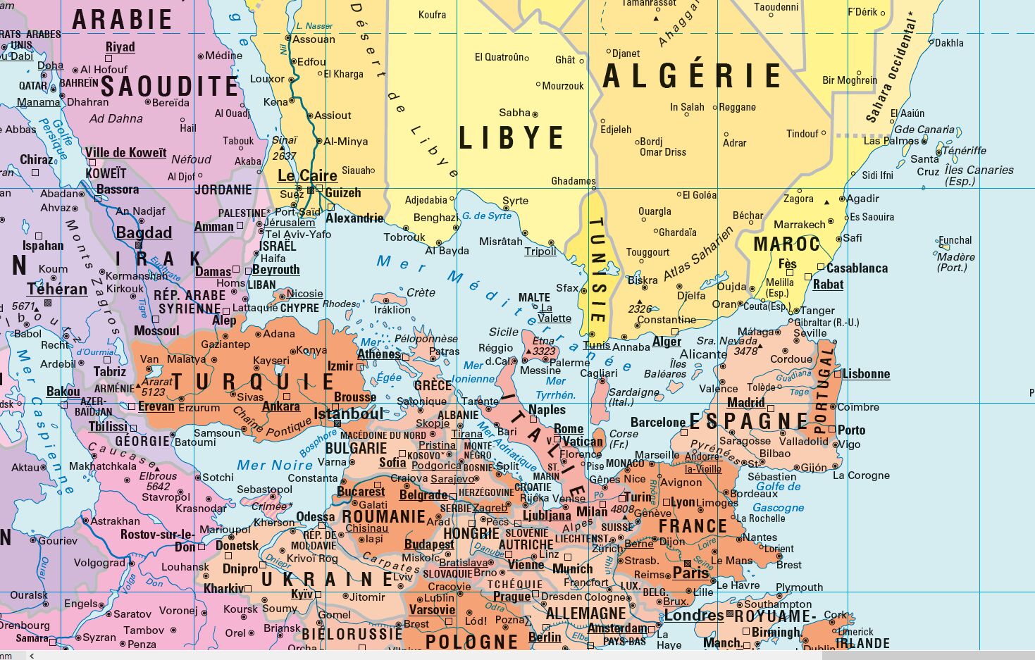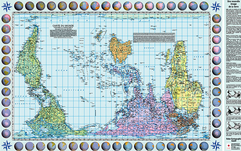 Diese flächentreue politische Weltkarte in Petersprojektion und Französischer Sprache ist pazifikzentriert und südorientiert.Die Karte zeigt den Pazifik in der Mitte und den Atlantik an den äußeren Rändern. Zudem wird sie südliche Hemisphäre oben dargestellt, ...