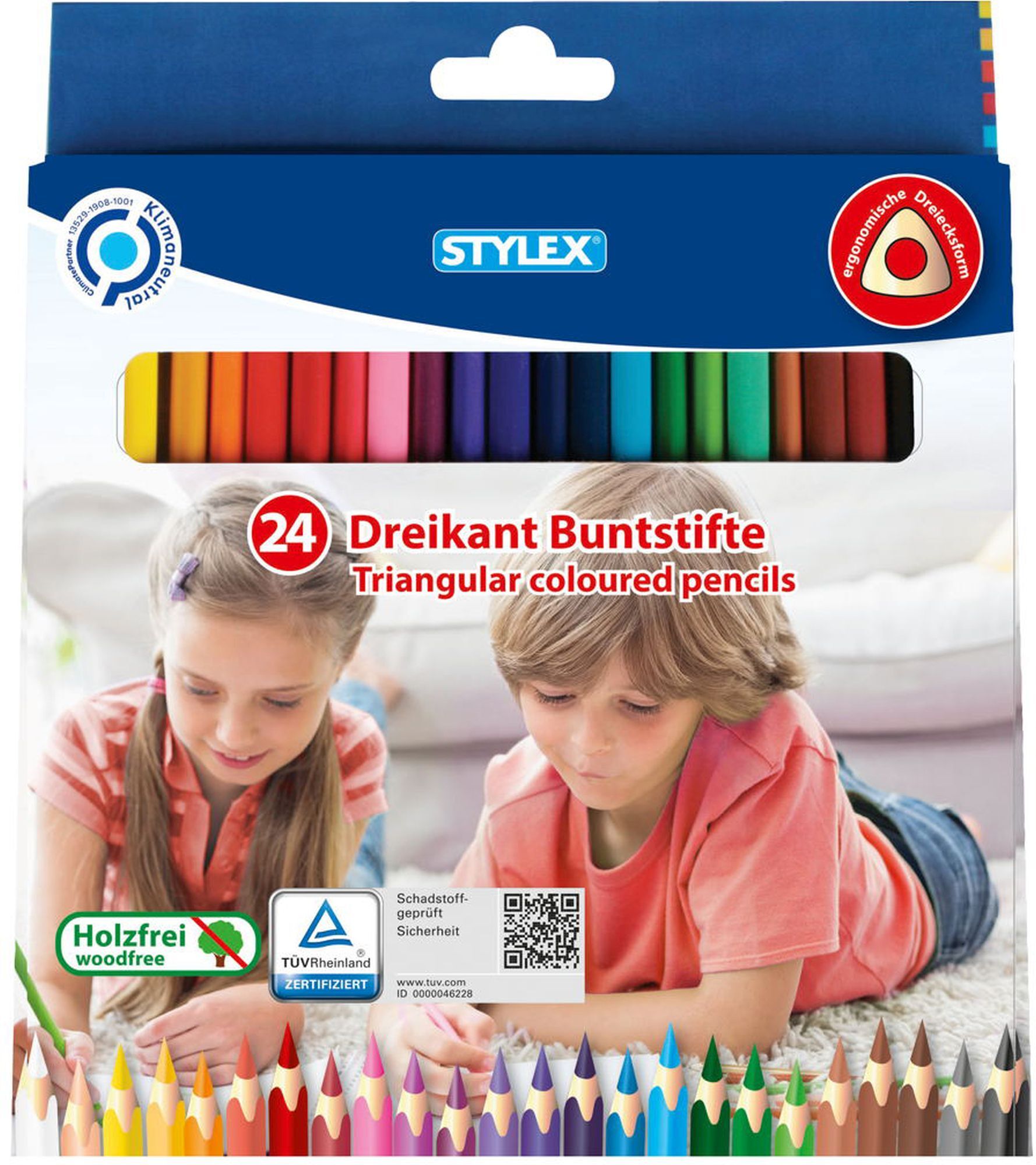 Stylex Dreikant-Buntstifte in der 24er Faltschachtel. Ergonomische Griffform. Große Farbauswahl für tolle Kunstwerke.
