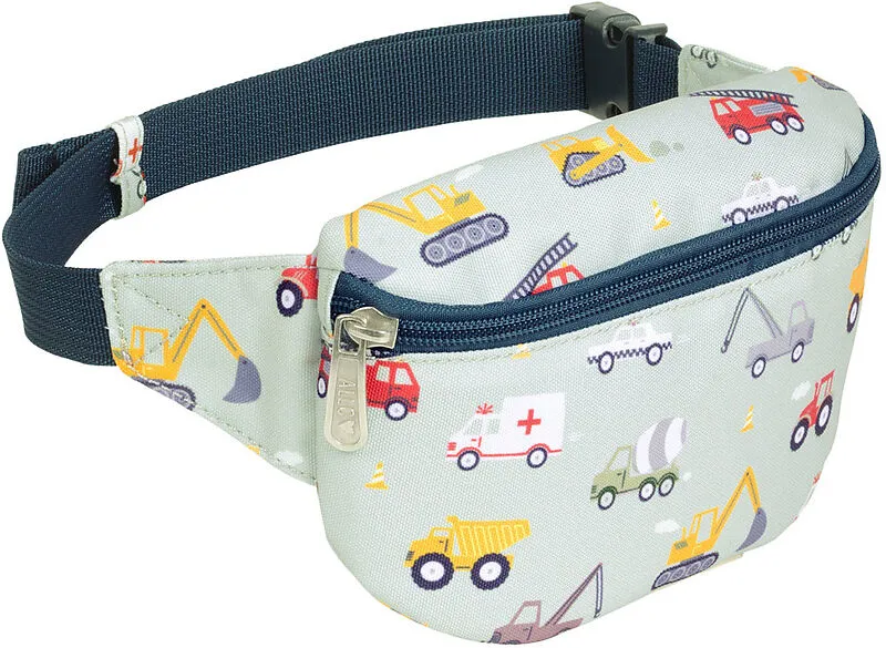 Bauchtasche Hellblaue Gürteltasche mit Fahrzeuge in Kindergrösse. Die Tasche verfügt über einen verstellbaren Tragegurt, sodass die Tasche auch als Crossbody Bag getragen werden kann. In die Vordertasche passen bequem Geldbörse und Handy. Auf der Rückseite be...