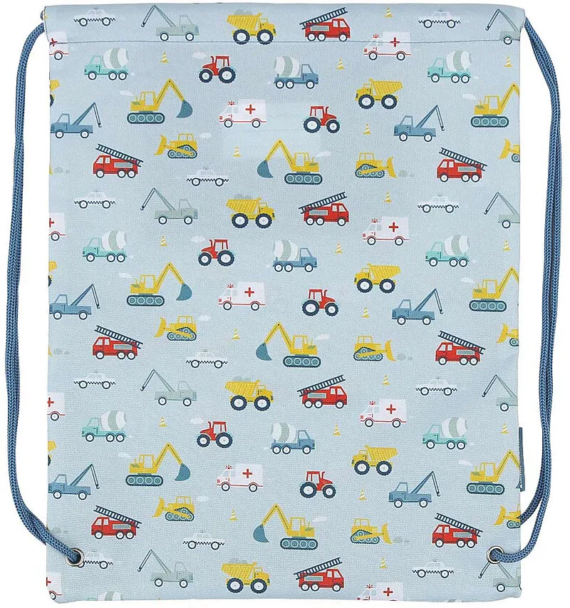 Turnbeutel Dieser hellblaue Turnbeutel mit Fahrzeuge ist ideal als Sporttasche für die Schule oder den Schwimmunterricht geeignet. Der Beutel ist leicht, einfach zu öffnen und zu schliessen und hat eine Innentasche mit Reissverschluss, um Wertsachen sicher au...