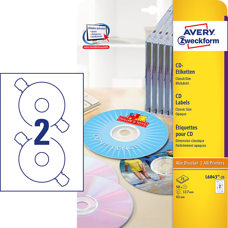 CLASSIC SIZE - CD-Etiketten Qualität vom Etiketten-Experten: die weissen, blickdichten CD-Etiketten L6043-25 im runden ClassicSize Format Ø 117 mm von Avery Zweckform eignen sich hervorragend zum professionellen Beschriften von CDs. 50 CD-Aufkleber auf 25 Bog...