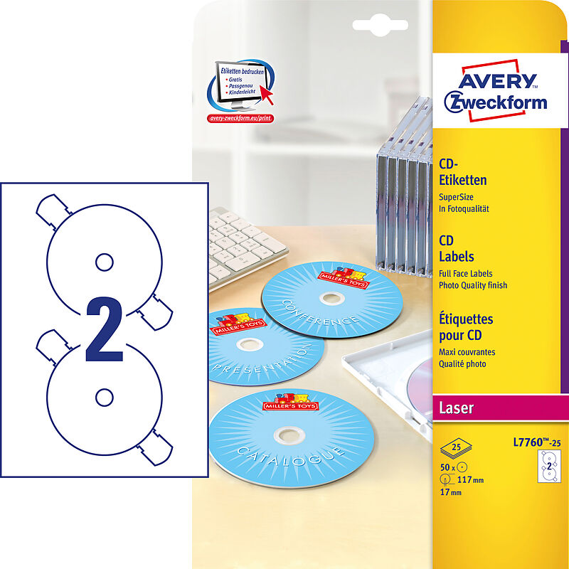 CD-Etiketten SuperSize Qualität vom Etiketten-Experten: die weissen, hochglänzenden CD-Etiketten L7760-25 im runden SuperSize Format Ø 117 mm für Laser-Drucker von Avery Zweckform eignen sich hervorragend zum professionellen Beschriften von CDs. 50 CD-Aufkleb...