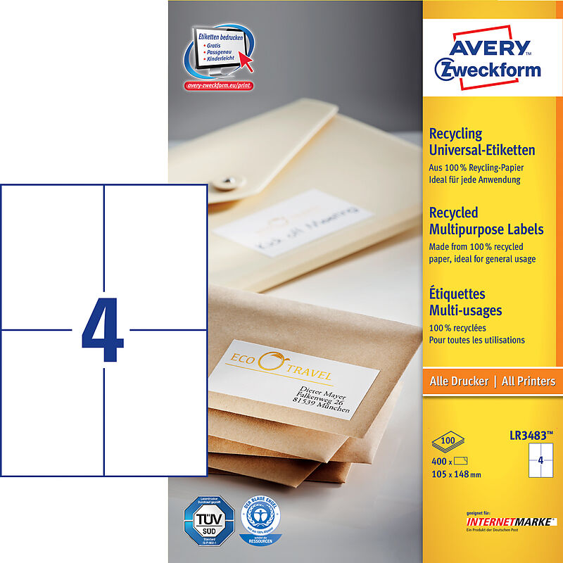 Universal-Etiketten Recycling Qualität vom Etiketten-Experten: die naturweissen Recycling-Etiketten LR3483 im Format 105 x 148 mm haften mit starker permanenter Klebkraft absolut zuverlässig auf Papier, Karton, Glas und vielen gängigen Kunststoffen. Sie sind ...