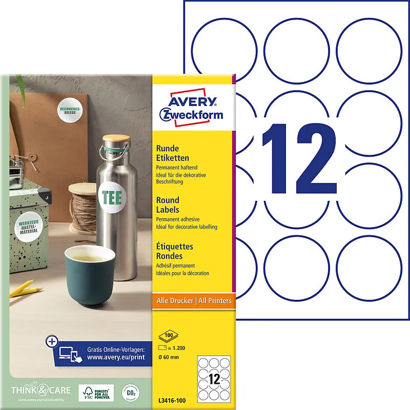 Markierungspunkte Qualität vom Etiketten-Experten: die weissen, runden Etiketten L3416-100 mit einem Durchmesser von 60 mm von Avery Zweckform sind ideal zum auffälligen Kennzeichnen von Produkten oder für Beschriftungen in Büro und Haushalt. 1.200 permanent ...