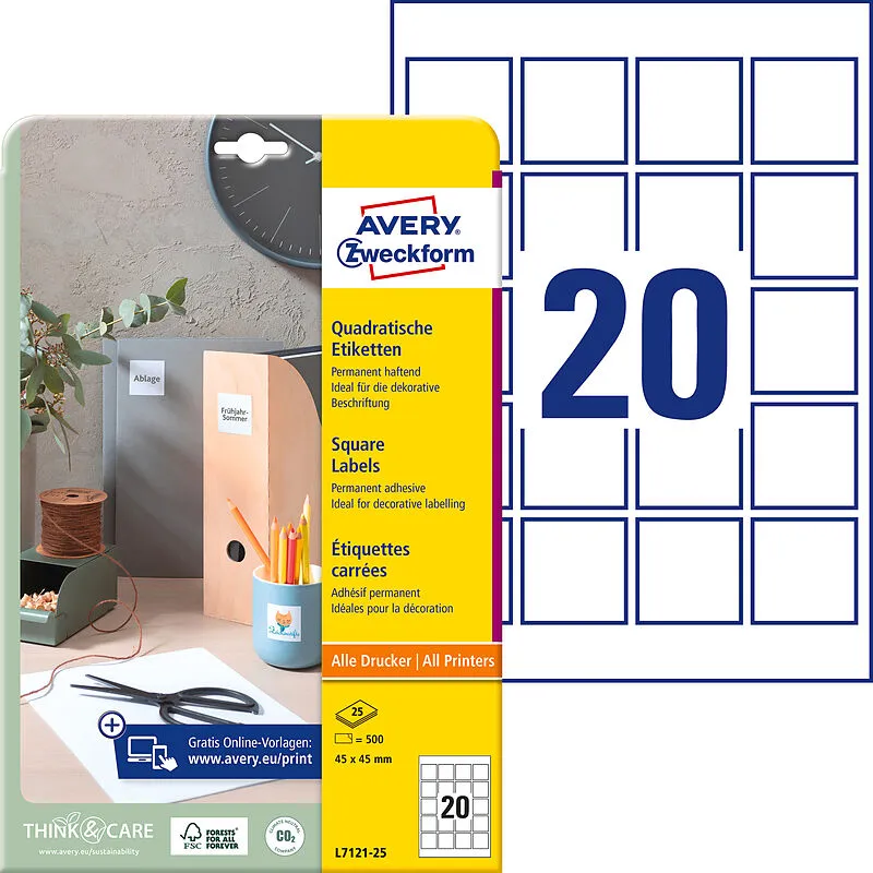 QR Code Etiketten Qualität vom Etiketten-Experten: die blickdichten, quadratischen Etiketten L7121-25 mit einem Format von 45 x 45 mm von Avery Zweckform sind ideal zum auffälligen Kennzeichnen von Produkten, für QR-Codes oder für Beschriftungen in Büro und H...