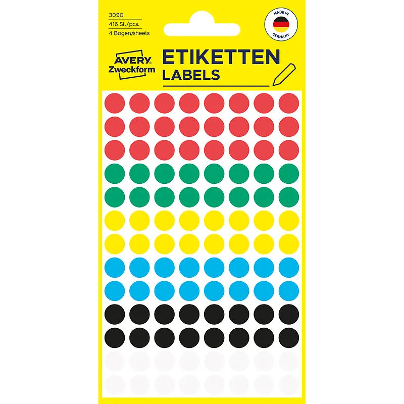 Markierungspunkte Die zur Handbeschriftung geeigneten Avery Etiketten sind zum Markieren, Organisieren, Terminieren und Planen bestens geeignet. Die selbstklebenden, runden Zweckform Etiketten sind vielseitig einsetzbar - sei es im Büro, im privaten Haushalt,...