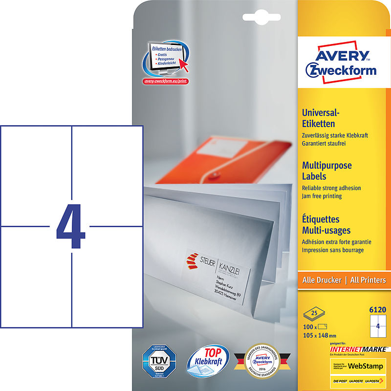 ULTRAGRIP - Universaletiketten weiss - 30 Bogen A4 Qualität vom Etiketten-Experten: die weissen Universal-Etiketten 6120 im Format 105 x 148 mm von Avery Zweckform haften mit starker permanenter Klebkraft absolut zuverlässig auf Papier, Karton, Glas und viele...