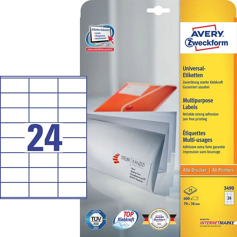 ULTRAGRIP - Universaletiketten weiss - 30 Bogen A4 Qualität vom Etiketten-Experten: die weissen Universal-Etiketten 3490 im Format 70 x 36 mm von Avery Zweckform haften mit starker permanenter Klebkraft absolut zuverlässig auf Papier, Karton, Glas und vielen ...