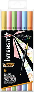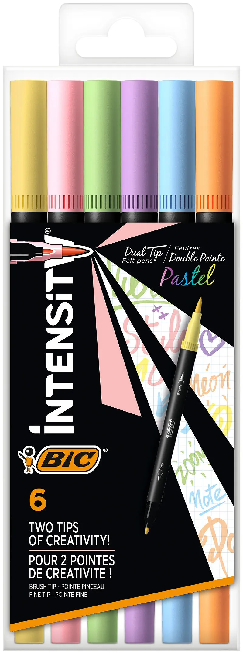 BIC - DUALTIP PASTEL CFP - Filzstifte Der BIC Intensity Dual Tip Filzstift ist ein echtes 2-in-1-Produkt mit feiner Spitze an einem Ende und einer Pinsel-Spitze am anderen. Dieser Pack enthält 6 verschiedene Stifte mit Doppelspitze mit einer feinen 0,7-mm-Fed...