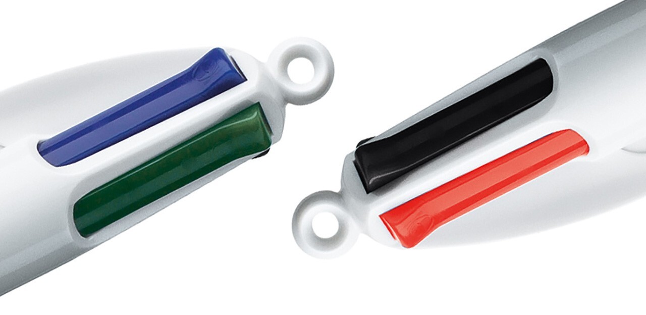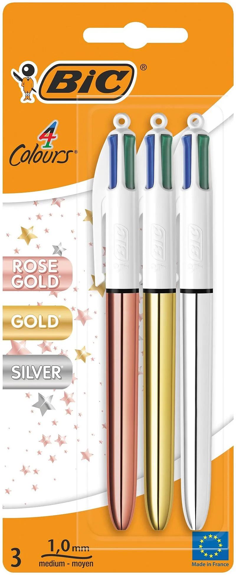 4-Farb-Druckkugelschreiber BIC 4 Colours rose gold. Druckmechanik. Ausführung Mehrfarbkugelschreiber: 4 Minen in blau, schwarz, rot, grün. Typbezeichnung der Mine: refill 4 colours. Ausführung Mine: dokumentenecht (blau, schwarz, grün), 0,4 mm, Mine auswechsel...