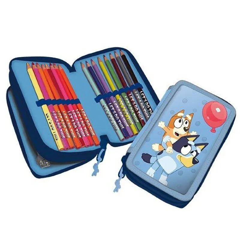 Bluey gefülltes Etui mit 2 Fächern, 19.5x12.5x5cm. Inhalt: Lineal 15cm, Sticker, Bleistifte, Spitzer, Radiergummi, Notizblock, Buntstifte.