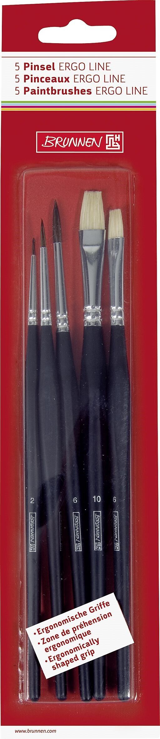 Holzstiele schwarz lackiert; Inhalt: 3 Feinhaarpinsel (Größe 2, 4, 6) und 2 Borstenpinsel (Größe 6, 10); Anzahl der Pinsel: 5; nahtlose Aluzwinge; hochwertige und umweltverträglich ausgestattete Pinsel für die Schule und viele Hobbytechniken.