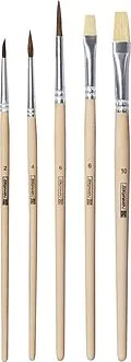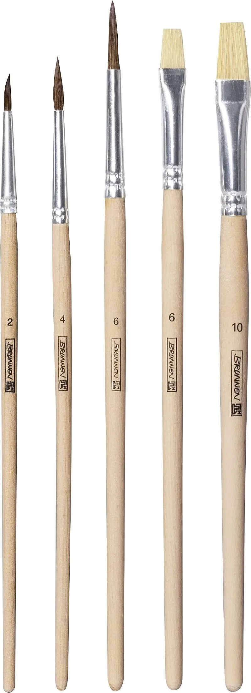 Stiele aus unlackiertem Naturholz; Inhalt: 3 Feinhaarpinsel (Größe 2, 4, 6) und 2 Borstenpinsel (Größe 6, 10); Anzahl der Pinsel: 5; im Kunststoffetui; nahtlose Aluzwinge; hochwertige und umweltverträglich ausgestattete Pinsel für die Schule und viele Hobbytec...