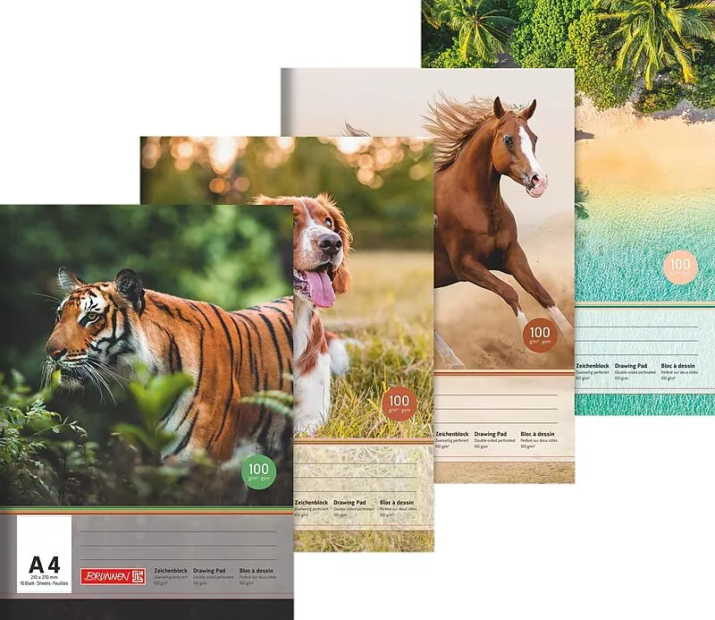 Format: A4; zweiseitig perforiert, gefälzelt.Inhalt: 1 Block mit 10 Blatt; 100 g/m; Sortierung: 4 unterschiedliche Motive (Tiere); eine Auswahl ist nicht möglich.