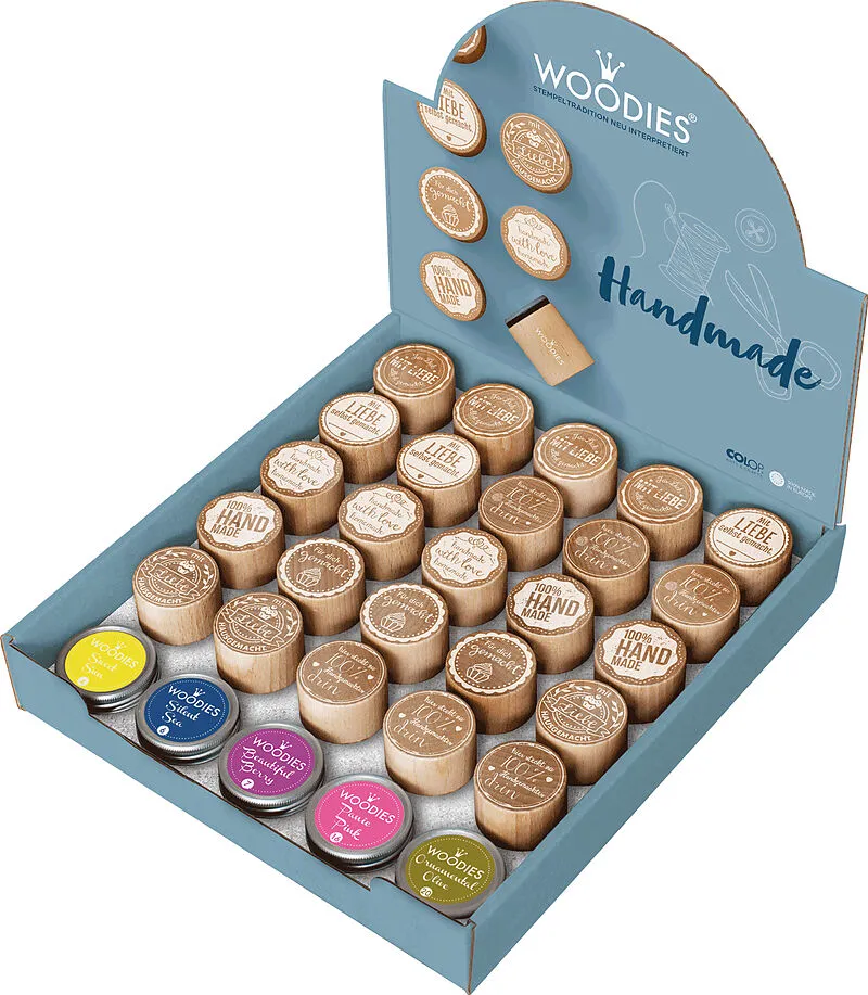 WOODIES - Motivstempel Holz Liebevolle Handarbeit trägt eine persönliche Handschrift. Mit den Woodies wird hausgemachten Marmeladen, Tortenspitzen, Muffinförmchen oder selbstgebastelten ein liebevoller Stempel aufgedrückt. Display mit 25 Stempeln und 5 Kissen...