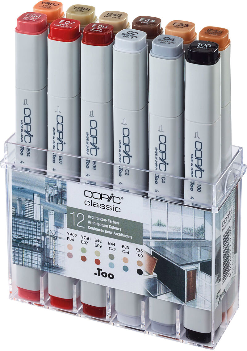 Grafikmarker Classic Set Architektur-Farben, 12 Stück Copic Classic 12er Set Architekturfarben. Erfahrene Design-Experten haben dieses Set entwickelt. Mit den jeweils nur 12 Farben (11 Farben plus Schwarz) lässt sich das Thema Architektur perfekt darstellen. ...