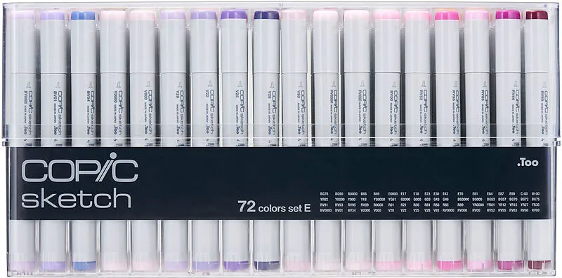 Sketch Set E, 72 Stück Ein perfektes Set für jede Farbillustration und jedes Kunstwerk. Es enthält eine breite Palette von 000 hellen Mischfarben, Wein- und Naturfarben. Die gesamte Palette der 358 Copic Sketch-Farben wird vollständig, wenn die Sketch 72er Se...