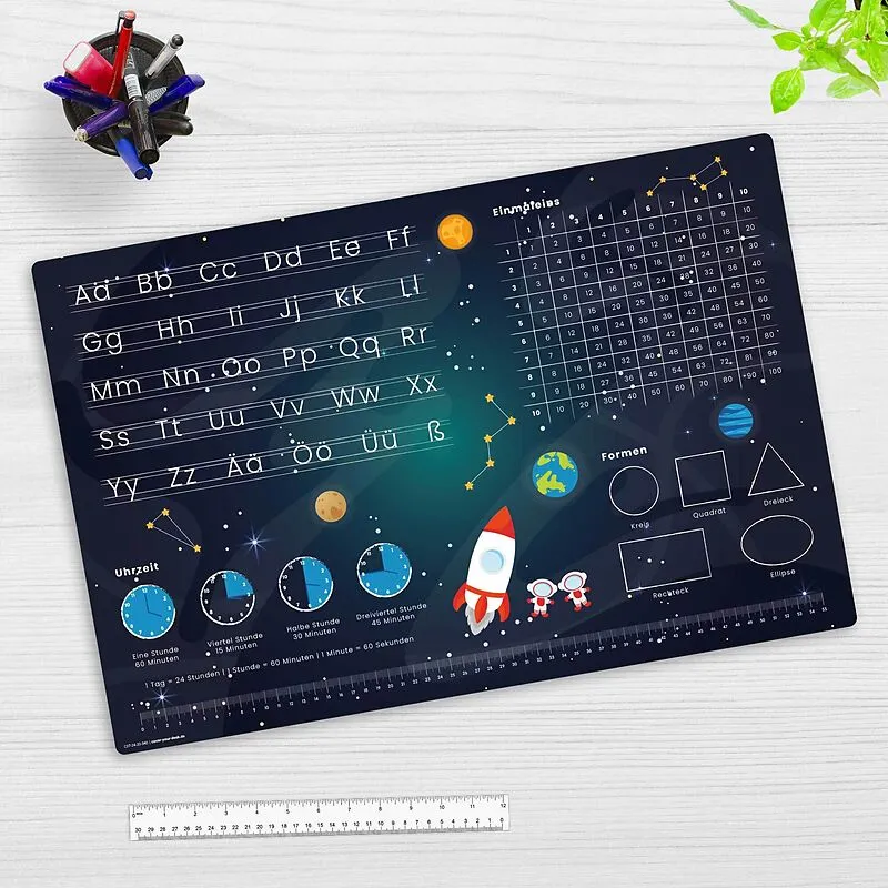 Diese Schreibtischunterlage aus 1,6mm dickem, hochwertigem Premium Vinyl bietet einen angenehmen Schreibkomfort und eine tolle Haptik. Sie wird in Deutschland hergestellt. Das optimale Format von 60 x 40 cm bietet ausreichend Platz für Hefte, Bücher, T...