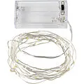 Batteriebetriebene Lichterkette mit 20 LED-Lämpchen, bestehend aus beschichtetem Kupferdraht, in Abständen beklebt mit kleinen Leuchtdioden, sowie einem Batterie-Gehäuse. Benötigt werden 2 x AA-Batterien (Artikel 14000 - nicht im Lieferumfang enthalt