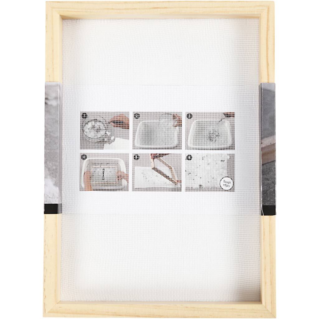 Lackierte einfache Rahmenform zur Herstellung von handgeschöpftem Papier. Diese Rahmenform ermöglicht die Anfertigung unregelmäßiger, wie gerissen aussehender Papierkanten. Die Rahmenklammern bestehen aus (auch beim Kontakt mit Wasser) nicht rostendem Edelstah...