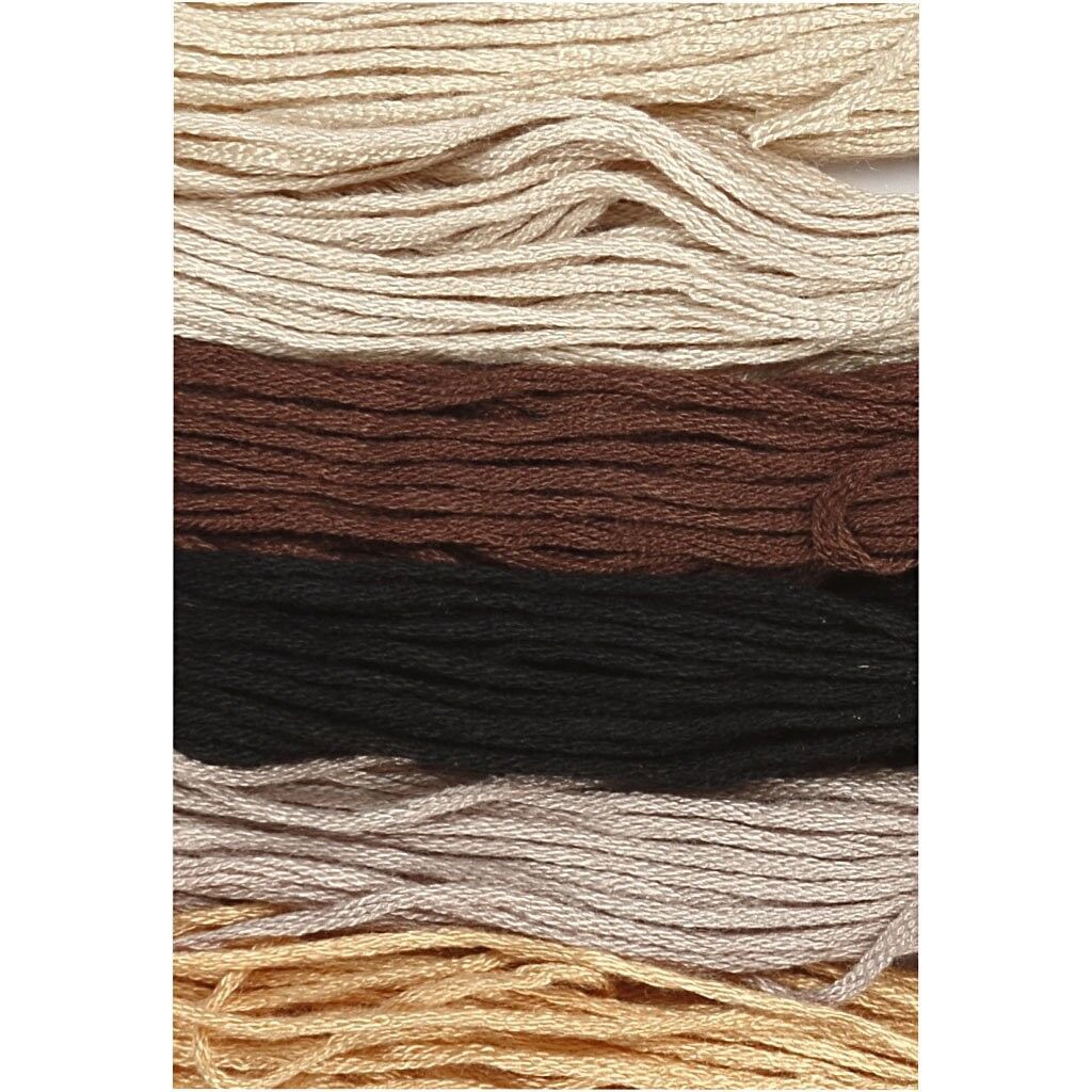 Stickgarn in sehr feiner Qualität; 6-fädig, Dicke: 1 mm; 6 Bündel je 8 m; 100 % mercerisierte Baumwolle.