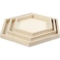 Sechseckige Tabletts in 3 verschiedenen Größen aus hellem Holz.