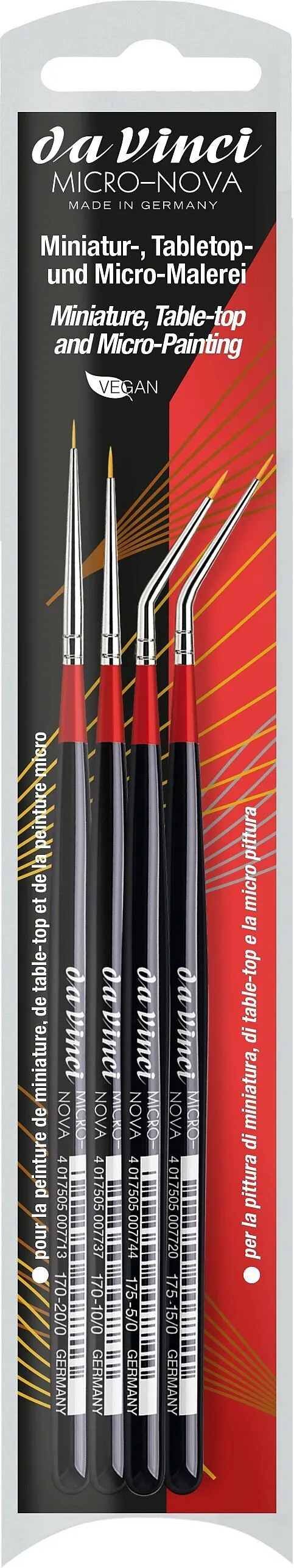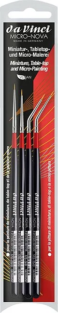 MICRO-NOVA Set - Serie 170 No. 20/0, 10/0 - 175 No. 15/0, 5/0 Farbentyp: Acryl, Öl Malgrund: Kunststoff, Zinn, Papier Anwendung: Miniaturmalen, Modellbau, Table-Top, Zinnfigurenmalerei Haare/Fasern: Synthetikfasern Zwinge: sog. Silberzwinge Stiel: Holz Stiellä...