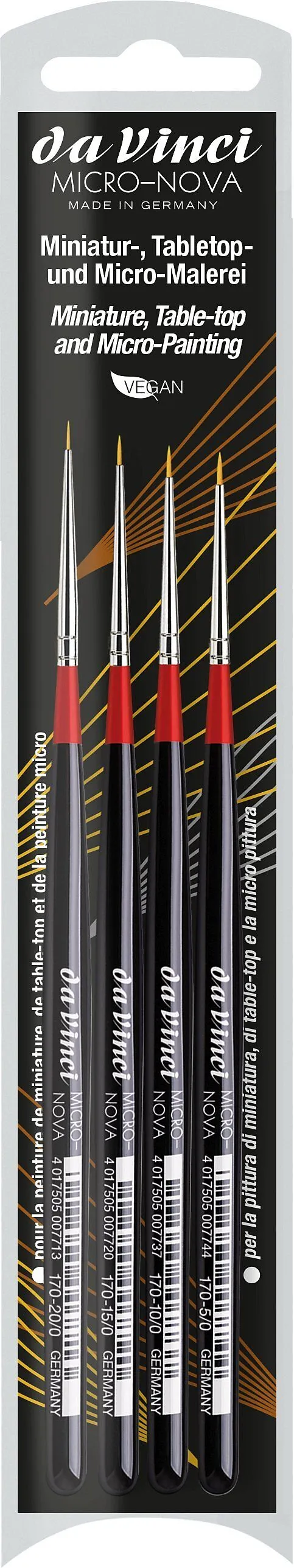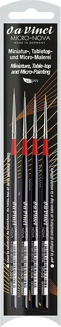 MICRO-NOVA Set - Inhalt je 1 Stück: Serie 170 No. 20/0, 15/0, 10/0, 5/0 Farbentyp: Acryl, Öl Malgrund: Kunststoff, Zinn, Papier Anwendung: Miniaturmalen, Modellbau, Table-Top, Zinnfigurenmalerei Haare/Fasern: Synthetikfasern Zwinge: sog. Silberzwinge Stiel: Ho...