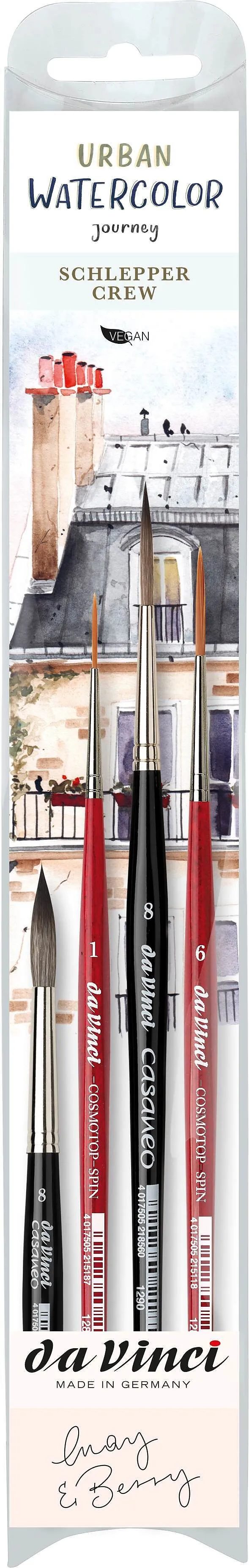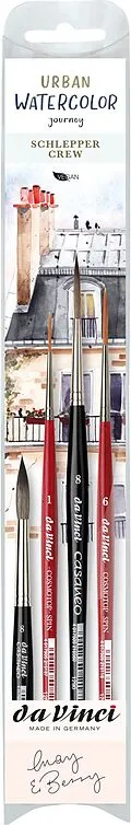 Urban Watercolor Journey Schlepper Crew by May & Berry, Inhalt je 1 Stück: 989 No. 8, 1280 No. 1 + 6, 1290 No. 8, in transparenter BIO-PET Verpackung Farbentyp: Aquarell, Gouache Malgrund: Papier Anwendung: Urban Sketching, Aquarellmalerei Haare/Fasern: Synthe...